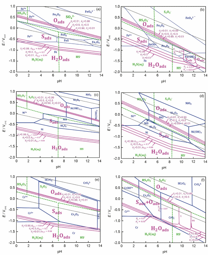 S-H2O体系的E-pH图仅从热力学上考虑了S的存在形式,当有金属存在时,E-pH图中需考虑S与金属的相互作用。例如:某一电位和pH的范围有金属的硫化物生成。Marcus等[17~19]和Protopopoff等[20]系统地计算了25和300 ℃条件下S-Fe-H2O、S-Ni-H2O、S-Cr-H2O和S-Cu-H2O体系的E-pH图,较全面地总结了S与金属的相互作用以及可能的存在形式,并考虑了吸附S (Sads)的影响,如图1[17~20]所示。图1中S的浓度均为10-4 mol/kg,可溶性金属离子的浓度均为10-6 mol/kg。值得注意的是Sads主要存在于E-pH图的中间区域,且在很宽的pH范围内都能存在,图中3条线给出了当S的相对吸附量分别为0.01、0.5和0.99时的情形。当电位较正时,吸附的水分子可被吸附的S或OH-取代。图1a和b分别为25和300 ℃条件下S-Fe-H2O体系的E-pH图。S可与Fe作用生成FeS2和FeS。但是在300 ℃条件下Fe主要以氧化物和氢氧化物存在。25 ℃条件下Ni与Fe的E-pH图相似,NiS和Ni3S2的存在电位和pH区间比较宽(图1c);与Fe不同的是,300 ℃条件下仍然有NiS和Ni3S2存在,如图1d所示。Cr的情况与Fe和Ni有所不同,Cr不与S发生反应,依然可以形成氧化物和氢氧化物,如图1e和f所示。因此,S对Cr腐蚀的影响比Fe和Ni要小很多。