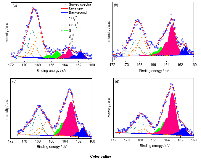 Fig.5 XPS sulfur detailed spectra in 0.6 mol/L chloride+0.075 mol/L thiosulfate (a, c) and 0.6 mol/L chloride+0.5 mol/L thiosulfate (b, d) at 40 ℃ (a, b) and 90 ℃ (c, d)