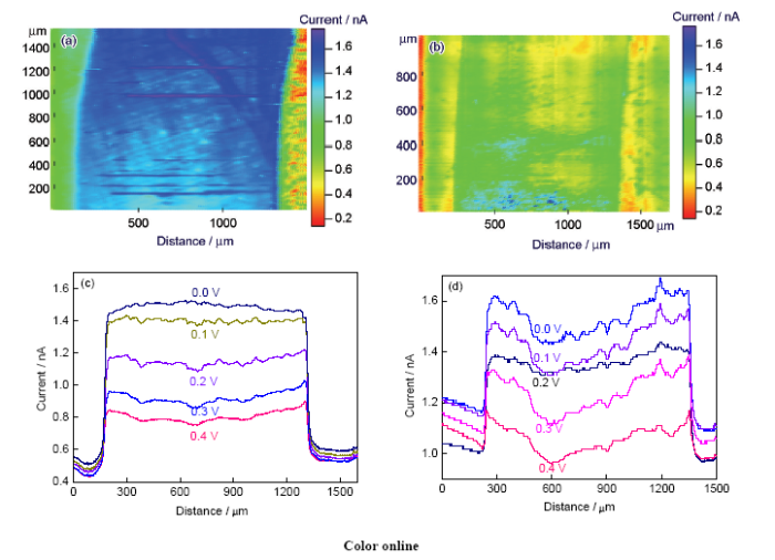 Fig.8 SECM images (a, b) and line-scan (c, d) current distributions of unstressed (a, c) and stressed (b, d) C-ring samples[