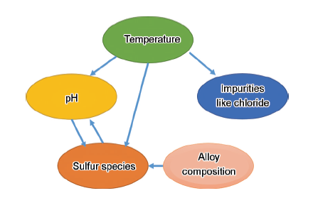 硫致钝化膜腐蚀失效受上述因素共同影响,其相互作用的示意图如图9所示。温度会影响溶液的pH值,温度越高,pH值越低,溶液的腐蚀性越强。