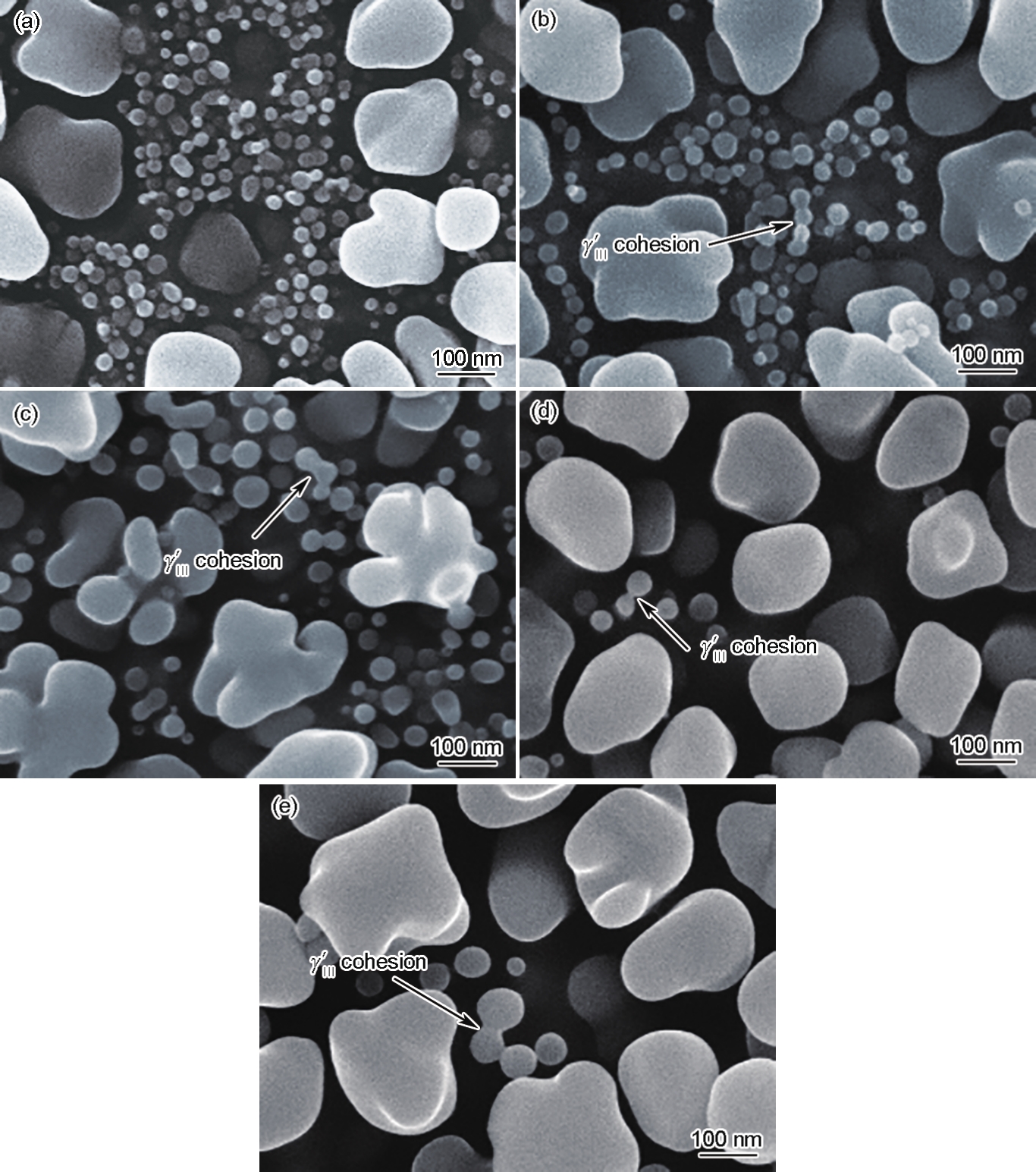 | Fig.8 Morphology characteristics of γ'Ⅲ in FGH4720Li alloy after ageing at 730oC for 30 h (a), 100 h (b), 200 h (c), 500 h (d), and 3000 h (e) |