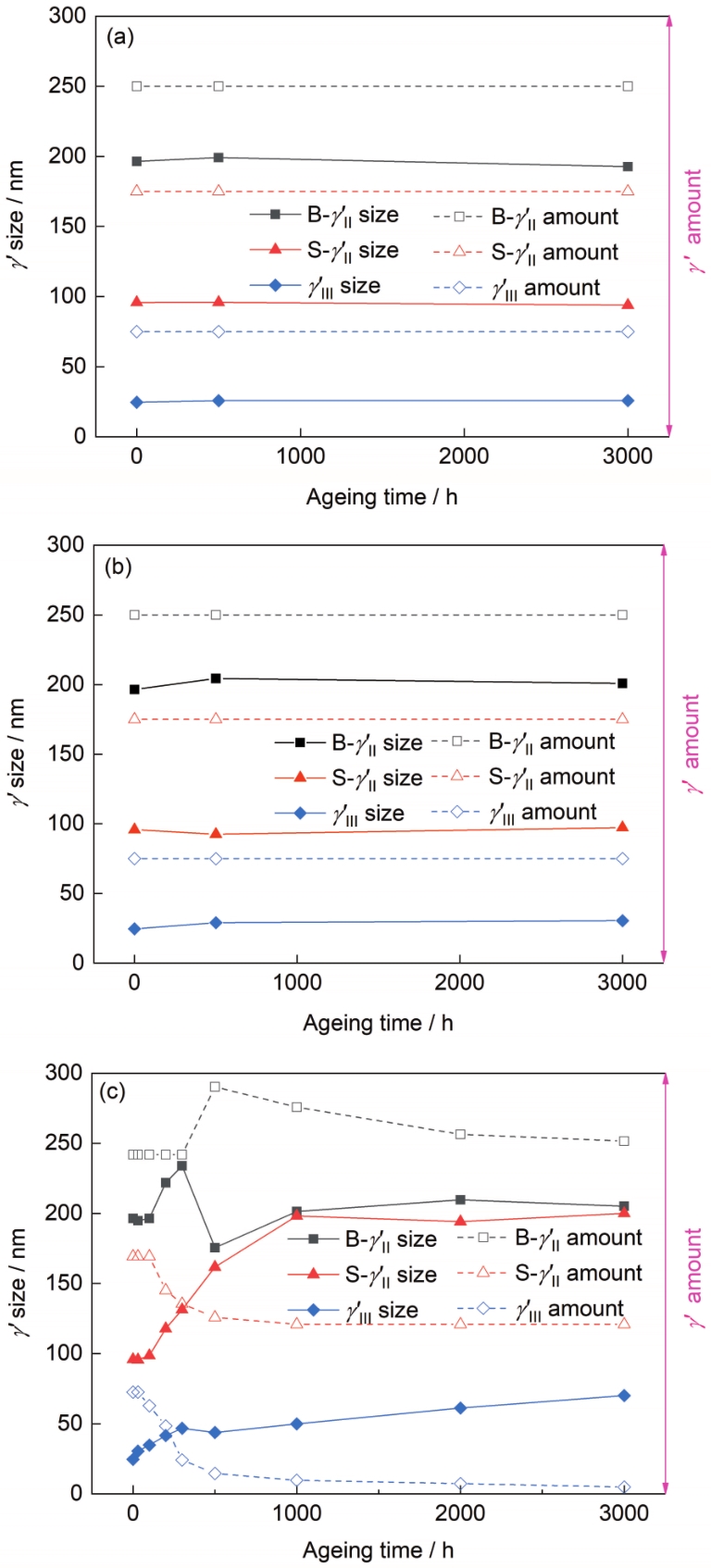 | Fig.9 Size and amount variation of different γ' during ageing at 600oC (a), 650oC (b), and 730oC (c) |