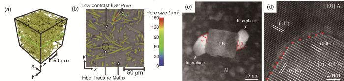 [26 ] Representative microstructural features of Al-based metal matrix composites (MMCs), including three-dimensional mapping with reinforcement fibers in yellow together with pores in black (a)[20 ] and cross section of the x-y plane with pores density highlighted by gradient color (b)[20 ] , and high-angle annular dark-field scanning transmission electron microscopy (HAADF-STEM) images showing heterogeneous precipitation (c)[26 ] and misfit dislocations (d)[26 ] at the TiB2 /α -Al interfaces Fig.1 ![]()