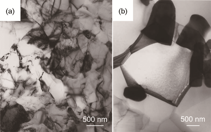 ... 然而,MMCs在实际应用中仍然面临一些棘手难题,并大致可归为2大类.(i) 大体积分数的增强相对延性的损害.由于增强相颗粒往往需要通过离位(ex-situ)添加的方式人为引入,因而极易在材料制备过程中发生团聚,并保持与基体非共格或半共格界面.而较大尺寸的增强相颗粒由于其极大的脆性,很容易在材料变形过程中发生自身断裂及/或作为裂纹源[29 ,30 ] ,导致MMCs的塑-韧性通常显著弱于其作为基体的传统时效强化铝合金.同时,因增强相独特的“应力传递”强化机制(load-transfer strengthening mechanism),绝大多数MMCs均需保持15% (体积分数)以上的增强相以提供足够高的强化效果.而如此高的外加颗粒添加量对于塑-韧性的潜在损害将被进一步放大.以公式(1) 为例,这实际上反映了微米/亚微米级增强相在热稳定性相关参数ω ( T ) 上具有极大优势,但对于σ R T 的提升却依赖于“以量取胜”,实际强化效率并不高.(ii) 非共格的颗粒/基体界面对于随后原位(in-situ)生成的纳米析出相产生有害影响.由于基体与增强相颗粒模量差距大,金属基复合材料在制备后冷却的过程中极易在增强相颗粒界面附近引入大量位错(thermoelastic stress induced dislocations,TSIDs).巨大的晶格畸变极易在相应区域内引起析出行为异常,不仅在增强相表面极易出现平衡相析出(图1 c和d[26 ] ),同时也在其周围形成粗大析出带(coarse precipitate zones,CPZs)及/或无析出带(precipitate free zones,PFZs)[31 ~33 ] ,严重损害材料性能. ...