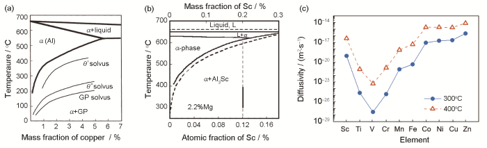 ... 综上典型的耐热铝合金中的微观组织特点可以发现,在材料设计层面,对于陶瓷相、共晶相等具有本征高熔点或由慢扩散的TM元素组成的第二相而言,相比于热稳定化,更需要着重考量其强化效果;而采用Cu、Zn、Mg等快扩散、大固溶度的合金化元素形成强化相时,则需要着重关心其热稳定性.为便于对比,图4 [12 ,62 ,64 ~66 ] 给出了典型的“快元素”Cu对应的Al-Cu二元相图[62 ] 与“慢元素”Sc对应的Al-Sc[64 ] 二元相图,以及高温下常见合金化元素的扩散速率[12 ,65 ,66 ] .由此可以得到一个推论:对于高性能耐热铝合金而言,最佳的微观组织设计方案其实是既需要“快元素”主导来提供强化效果,又需要“慢元素”参与以抑制微观组织失稳,二者相辅相成,不可偏废.特别值得注意的是,这一设计思路对于依赖析出强化的时效强化型铝合金而言则显得尤为贴合:通过Cu、Zn等“快元素”构建具有显著强化效果的析出相,而通过“慢元素”的微合金化,从而稳定化微观组织,提升材料性能.而关键在于,“快元素”与“慢元素”在承担各自角色的同时,其相互作用的好坏将直接影响体现了合金材料在微观组织层面的设计偏好,亦即在强化策略及热稳定策略中是否存在单方面的倾斜,并最终反映材料的外在宏观性能上. ...