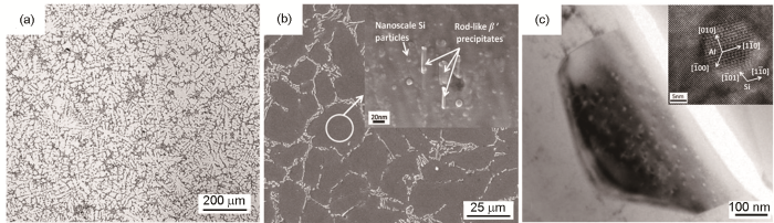 ... 与经典的Al-Fe-V-Si体系不同,Al-Si系合金中的主合金化元素Si主要作用是引发α -Al+Si共晶反应(约12.6%Si (质量分数),约577℃[97 ] ).这使得Al-Si合金具有极为优秀的铸造性能,能够制备形状复杂的结构件,因而成为最受欢迎的商用铝合金体系之一.尽管Si在α -Al基体中的最大固溶度相对较高(约1.65%,质量分数),但由于缺乏相应的二元析出相和弥散相,特别是共晶组织实质上不仅难以起到足够的强化效果,初生Si颗粒与共晶Si颗粒本征的脆性还严重危害材料延性.因此,一般对于Al-Si合金系,需要添加Mg或Cu元素以改善其力学性能,相应的主体的微观组织设计思路与2xxx、6xxx合金系系出同门,亦即通过析出θ'- Al2 Cu、β'' 等纳米析出相以提升强度,对应常见的W319 (Al-Si-Cu基[11 ,98 ~102 ] )与A356 (Al-Si-Mg基[98 ,103 ] )等商用合金.简而言之,Al-Si系合金的主要微观组织设计思路为利用共晶反应提升铸造性能,同时利用纳米第二相的析出提供强化效果.根据上述微观组织特点,科研工作者在Al-Si系合金中针对经典纳米析出相的微合金化调控策略进行了大量的研究.值得注意的是,大量的微观组织调控研究实际上聚焦于如何优化α -Al+Si共晶相的形态以改善合金塑韧性,例如进行Sr[103 ~105 ] 、Na[104 ] 、TiB2 [103 ,106 ] 以及La[105 ~107 ] 微合金化,以及以上海大学李谦教授团队为代表的关于抗Si毒化作用的晶粒细化剂的系统性工作. ...