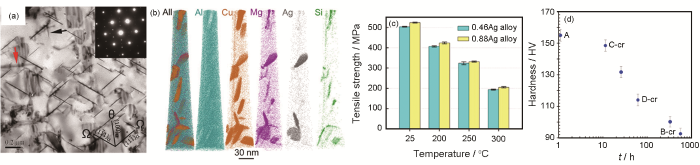 ... 事实上,针对Al-Cu-Mg-Ag基合金的大量前期开发早在20世纪90年代便由法国与澳大利亚政府共同推动,莫纳什大学Polmear教授等领导开发[6 ,7 ,160 ~162 ] ,聚焦于飞行器等关键选材尤其关心室温/高温高强度特点(室温屈服强度>400 MPa,180℃高温屈服强度>300 MPa),可以适应中-低温(180~200℃)及大应力(>200 MPa)的长期服役环境.近年来中南大学刘志义教授课题组使这一经典合金系再得以突破,在300℃高温区间实现了抗拉强度>200 MPa[152 ,154 ,155 ] ,见图9 c[155 ] .然而Ω 相实际上抗粗化能力仍存在缺陷,在高温下仍不可避免发生显著粗化,进而导致相应合金在长期>200℃的高温暴露后力学性能急剧下降,见图9 d[154 ] ,因而仍未能完全满足当前国家重大战略领域追求轻质铝合金材料在300~400℃高温区间内进行中/长期服役的迫切需求.因此,在总结前人经验基础上,进一步探寻适用于耐高温/长期服役铝合金的微观组织设计策略仍是业界的迫切需求. ...