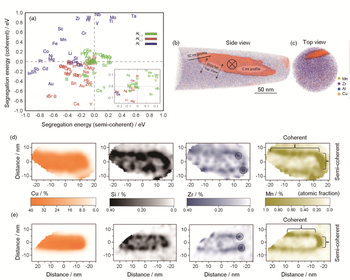 Segregation energies of solutes at each platelet (a)[169 ] and triple Mn/Zr/Si segregation at the coherent and semi-coherent interfaces between α -Al matrix and θ' -Al2 Cu (b~e)[167 ] Fig.10 ![]()