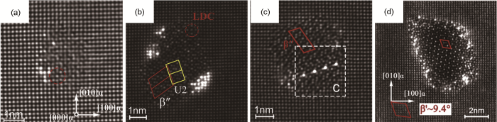 ... 近年来2xxx系耐热铝合金中的“明星产品”是以盘片状Ω 相为微观组织特点的Al-Cu-Mg-Ag基合金.在具有高Cu/Mg比的Al-Cu系合金中,微量Ag添加往往用以构建具有界面Mg/Ag双元偏聚结构的Ω 析出相,见图9 a[152 ] 和b[153 ] .值得注意的是,Ω 相区别于具有相对更低Cu/Mg比的Al-Cu-Mg合金中通常出现的S-Al2 CuMg相及其前驱体[6 ,15 ,159 ] .此外,Ω 相与经典的θ′- Al2 Cu相具有类似的盘片状形貌和成分,二者常常共存,其析出行为存在竞争关系,并受到合金化策略的调控[152 ~155 ] .但Ω 相的形成可以追溯到时效早期{111}α -Al 面上的Mg-Ag共团簇[62 ,160 ] ,因而具有独特的{111}α -Al 析出惯习面,具备相对于{100}α -Al 惯习面的θ′- Al2 Cu而言更为优异的强化效果和在200℃以下时更佳的热稳定性[161 ,162 ] . ...