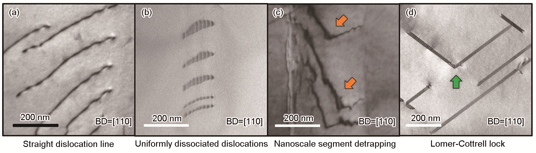 图3 不同合金中的位错形态 (a) Ni-3W (b) CrCoNi (c) CrCoNi-3W (d) Cr20Mn10Fe30Co30Ni10 |