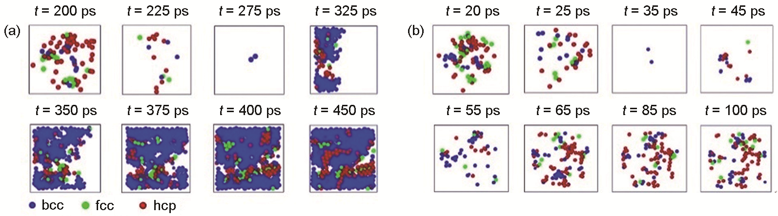 Fig.4 Evolutions of crystal bonds during the SLM process at energy densities of 30.8 J/mm3 (a) and 3.8 J/mm3 (b) (t represents time during the SLM process)[ |