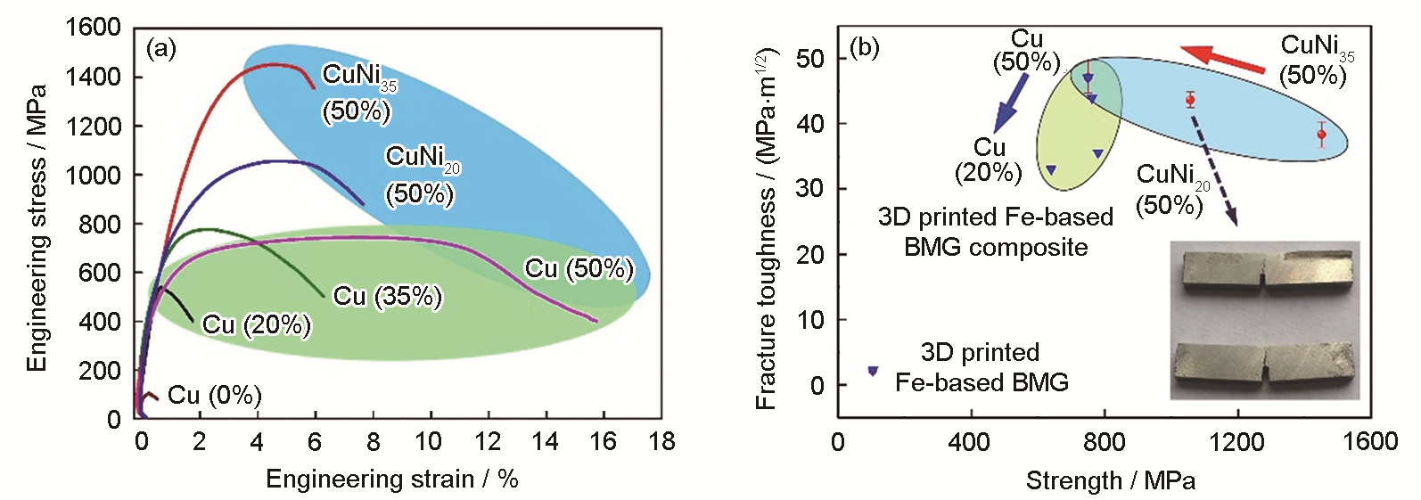 Fig.10 Compressive stress-strain curves of SLM processed specimens by mixing Cu powder (20%, 35% and 50%, mass fraction), CuNi20, and CuNi35 powders (50%, mass fraction), respectively (a) and mechanical properties of SLM processed Fe-based BMG composites by tuning the content or category of the second phase (b)[ |