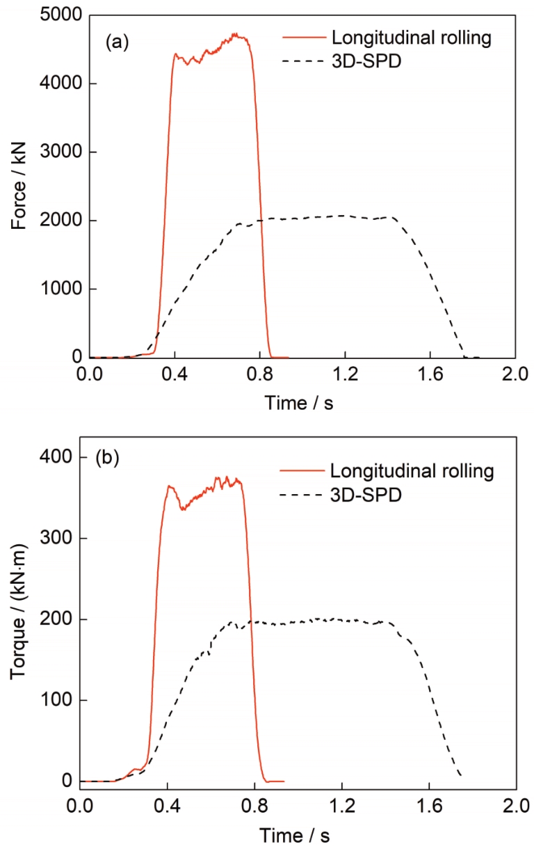Fig.6 Comparisons of forces (a) and torques (b) between traditional longitudinal rolling and 3D-SPD |