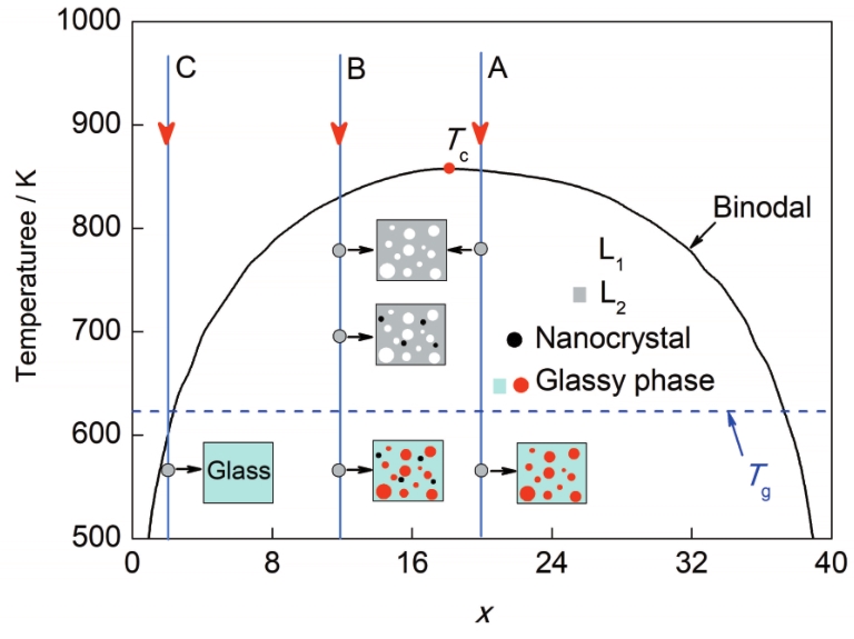 | Fig.3 Calculated miscibility gap of the Zr60Cu40-xFex alloy (Tc—critical temperature of liquid-liquid phase separation) |