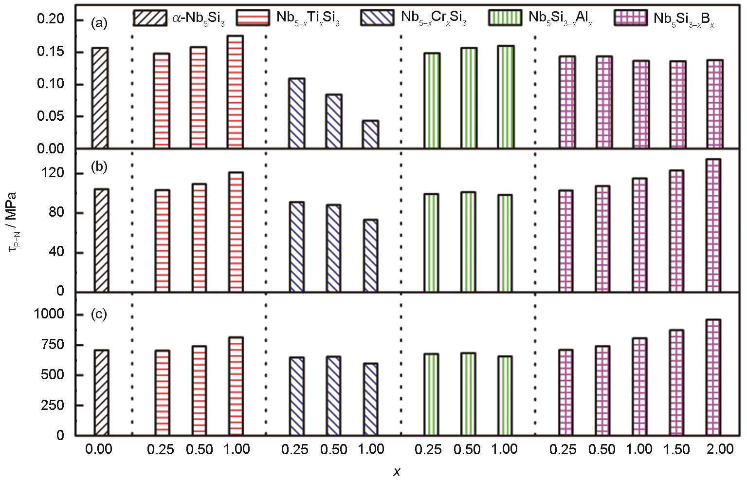 图4 α-Nb5Si3和合金化后的α-Nb5Si3的Peierls-Nabarro力(τP-N)计算值[ (a) {001)<100] slip system (b) {010)<100] slip system (c) {011)1/2<111] slip system |