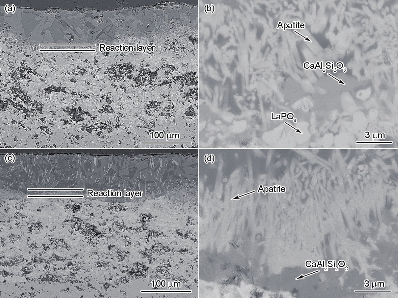 | Fig.5 Cross-sectional microstructures with low (a, c) and high (b, d) magnifications of LaPO4/YSZ coatings after CMAS attack at 1250oC for 2 h (a, b) and 10 h (c, d)[ |