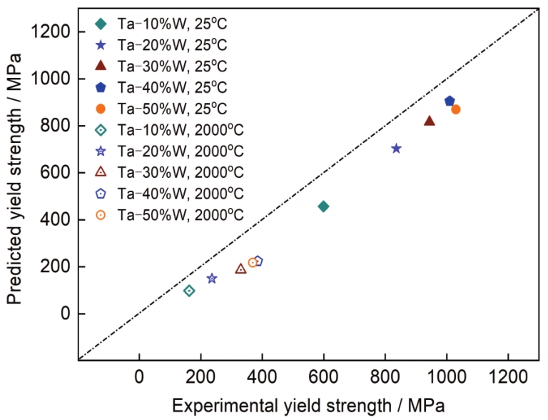 | 图6 25和2000℃下Ta-W合金理论模型预测和实验测量的压缩屈服强度的对比 |