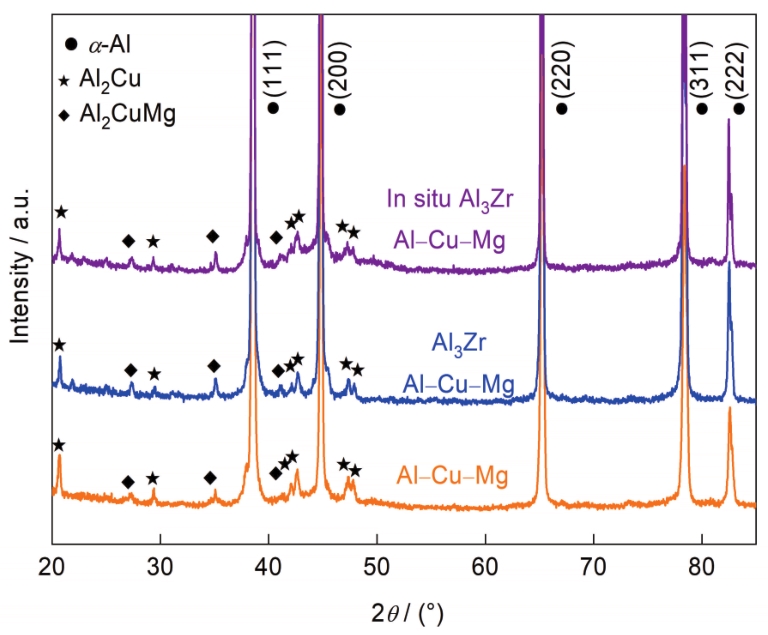 | Fig.7 XRD spectra of as-built Al-Cu-Mg alloys with or without nucleating agents |