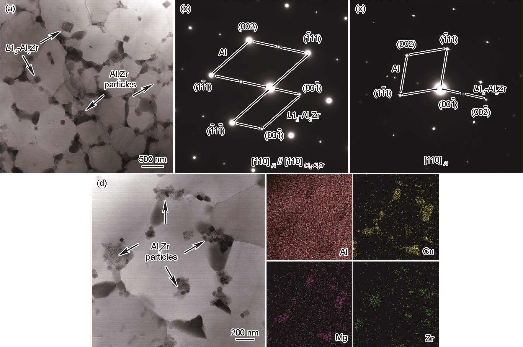 | Fig.8 Bright field TEM image (a), SAED patterns of L12-Al3Zr/Al with (b) or without (c) coherent interface, and EDS element maps (d) of as-built Al3Zr/Al-Cu-Mg alloys prepared with the laser energy density of 370 J/mm3 |