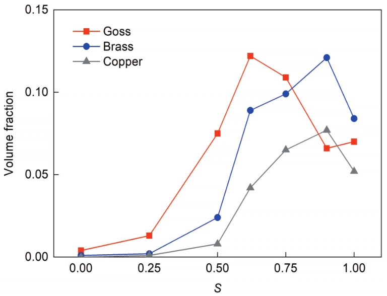 | Fig.10 Volume fractions of shear texture components in different thicknesses of industrial hot-rolled sheets (Allowable deviation angle is 15°) |