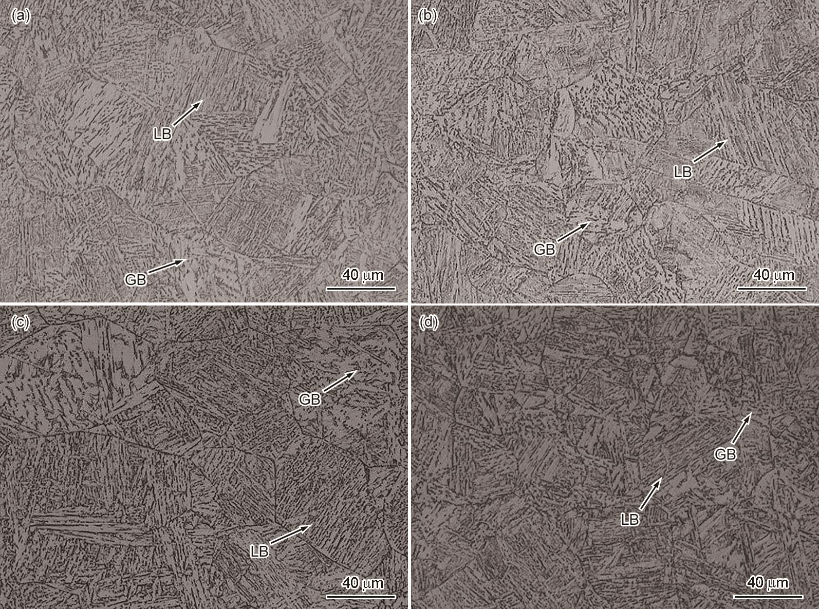 | Fig.3 OM images of CGHAZs with different heat inputs (LB—lath-like bainite, GB—granular-like bainite) (a) 15 kJ/cm (b) 20 kJ/cm (c) 25 kJ/cm (d) 30 kJ/cm |