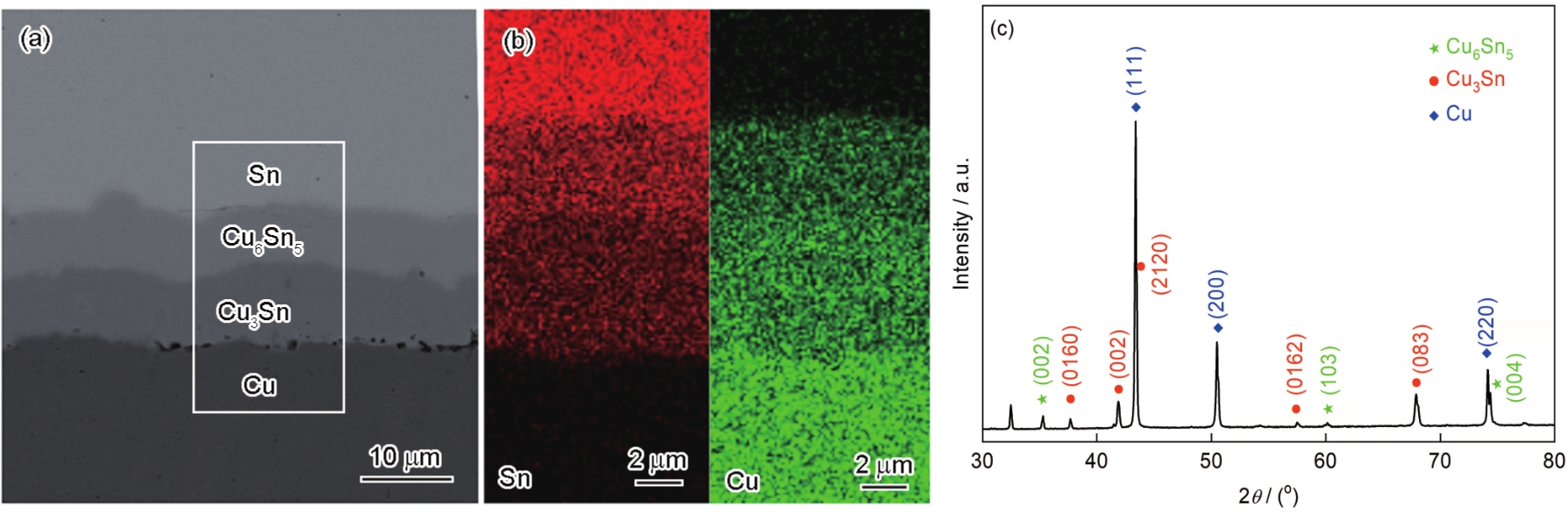 | Fig.2 Microstructure analyses of the interface for Cu-Sn diffusion couple specimens (a) SEM image of microstructure (b) EDS element maps of square region in Fig.2a (c) XRD spectrum of Cu-Sn specimen |