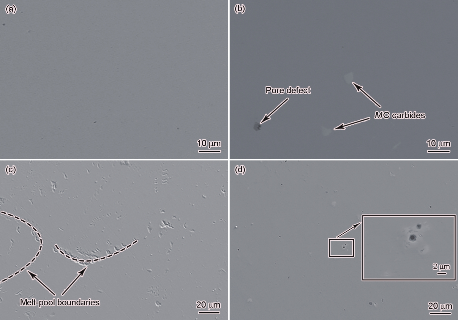 Fig.4 Surface morphologies of uncorroded (a, b) and corroded (c, d) SLM Inconel 718 (a, c) and R Inconel 718 (b, d) (Inset in Fig.4d shows the partial enlargement of corroded R Inconel 718) |