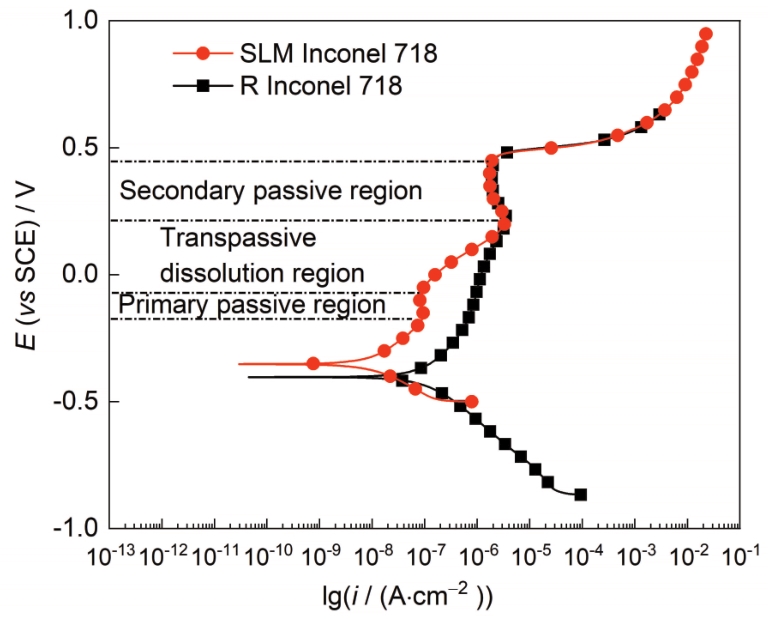 图3 SLM Inconel 718和R Inconel 718在0.1 mol/L NaOH溶液中的动电位极化曲线 |