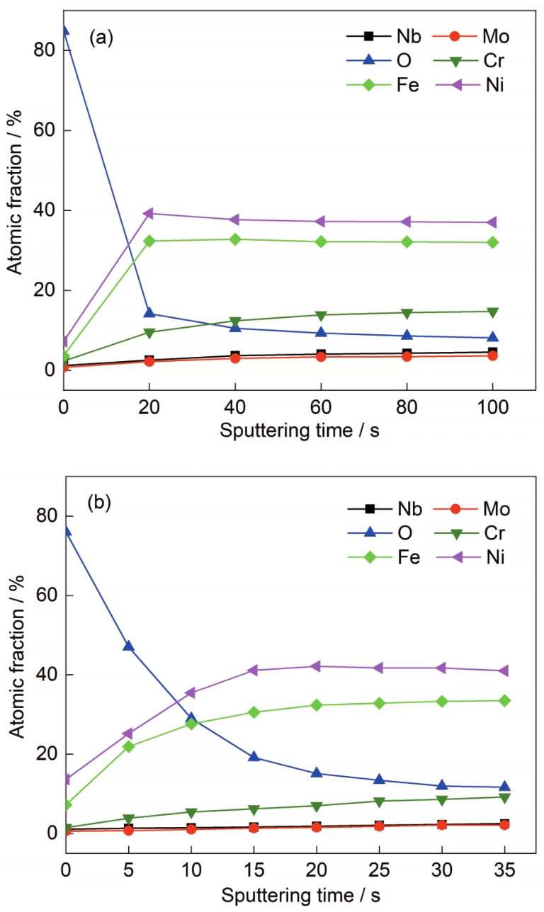 Fig.10 Depth profiles of the elements of passive films formed on SLM Inconel 718 (a) and R Inconel 718 (b) |