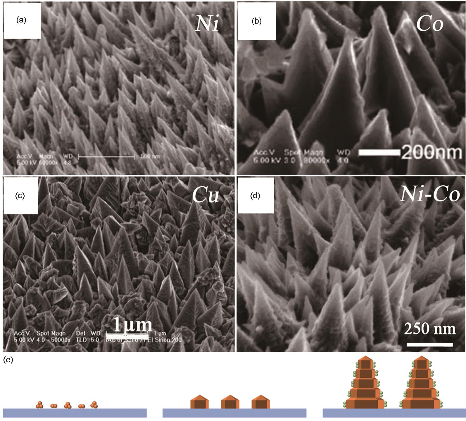 Fig.2 Ni[14] (a), Co[15] (b), Cu[17] (c), and Ni-Co[16] (d) nanocone array materials deposited by the electrochemical method; and the schematic diagram of metal Ni nanocone array growth (e)