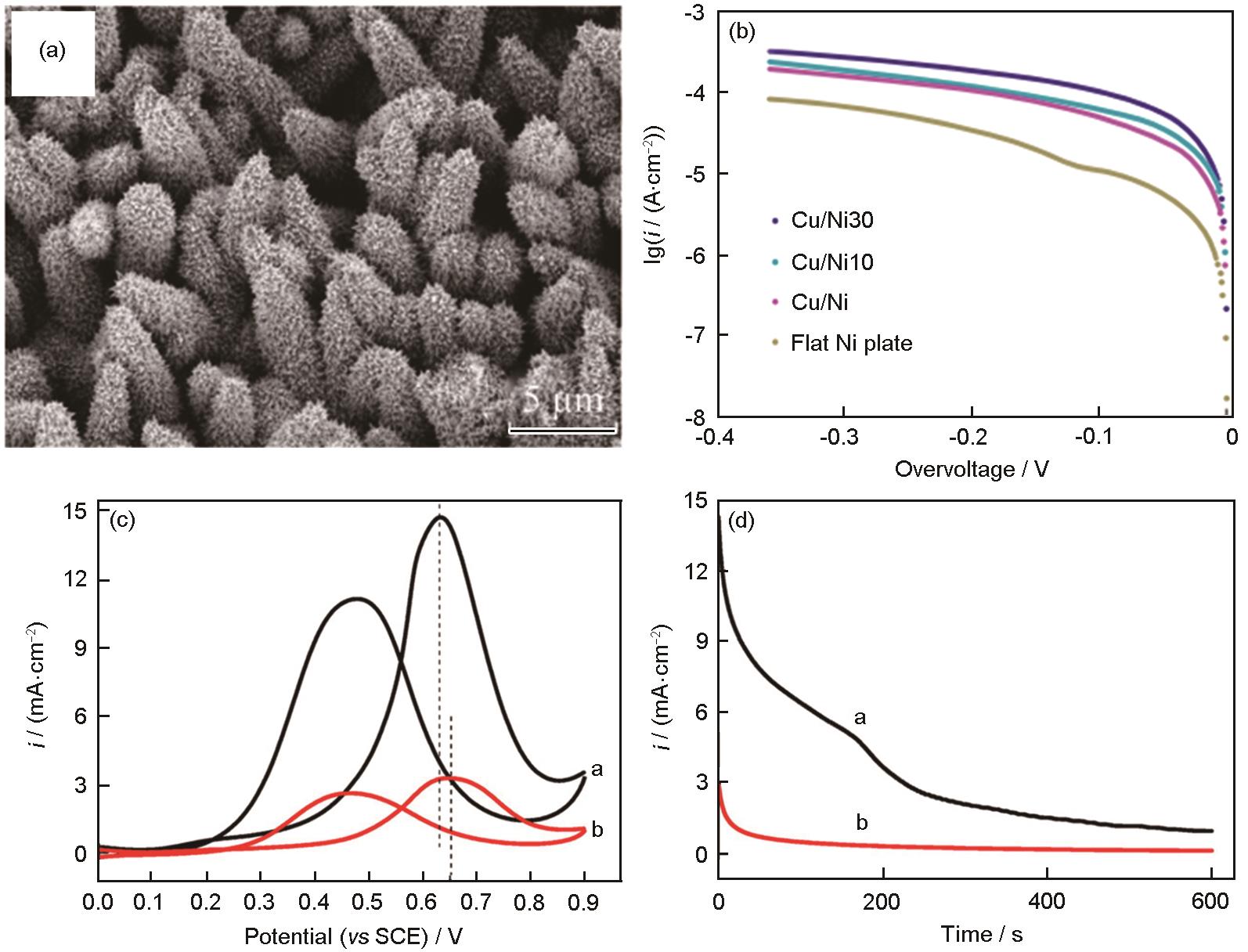 Fig.7 SEM image of Cu-Ni nanocone hierarchical structures (a) and the cathodic current-potential curves in hydrogen evolution reaction (HER) for the three hierarchical structures and the flat Ni (b)[ |