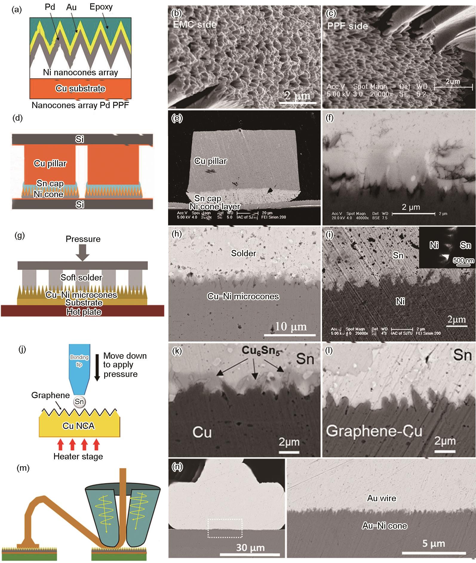 图10 微纳米阵列(纳米Ni针锥阵列预镀钯(Pd PPF),微纳米Ni、Cu、Cu-Ni针锥阵列,单层石墨烯复合微纳米Cu针锥阵列,Au-Ni纳米针锥阵列)与封装树脂、镀锡帽铜柱、焊料、Au线键合示意图及键合界面SEM像[ |