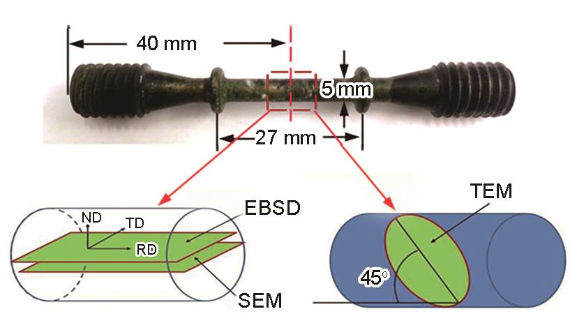 | Fig.1 Creep sample and analysis method (RD—rolling direction, ND—normal direction, TD—transverse direction) |