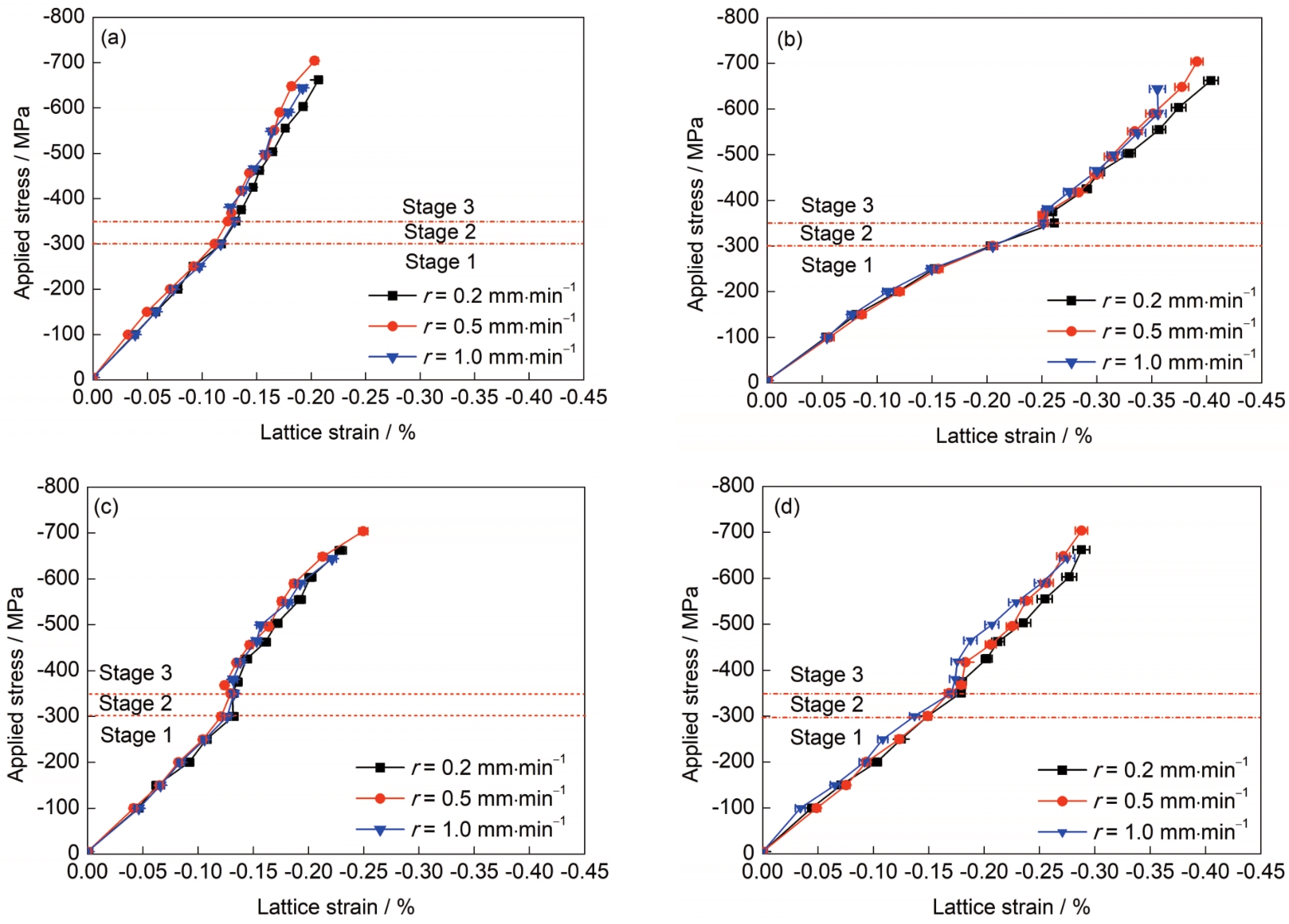 | Fig.3 Lattice strain as a function of applied stress for GH3625 alloy at different deformation rates and different (hkl) crystal planes (a) (111) crystal plane (b) (200) crystal plane (c) (220) crystal plane (d) (311) crystal plane |