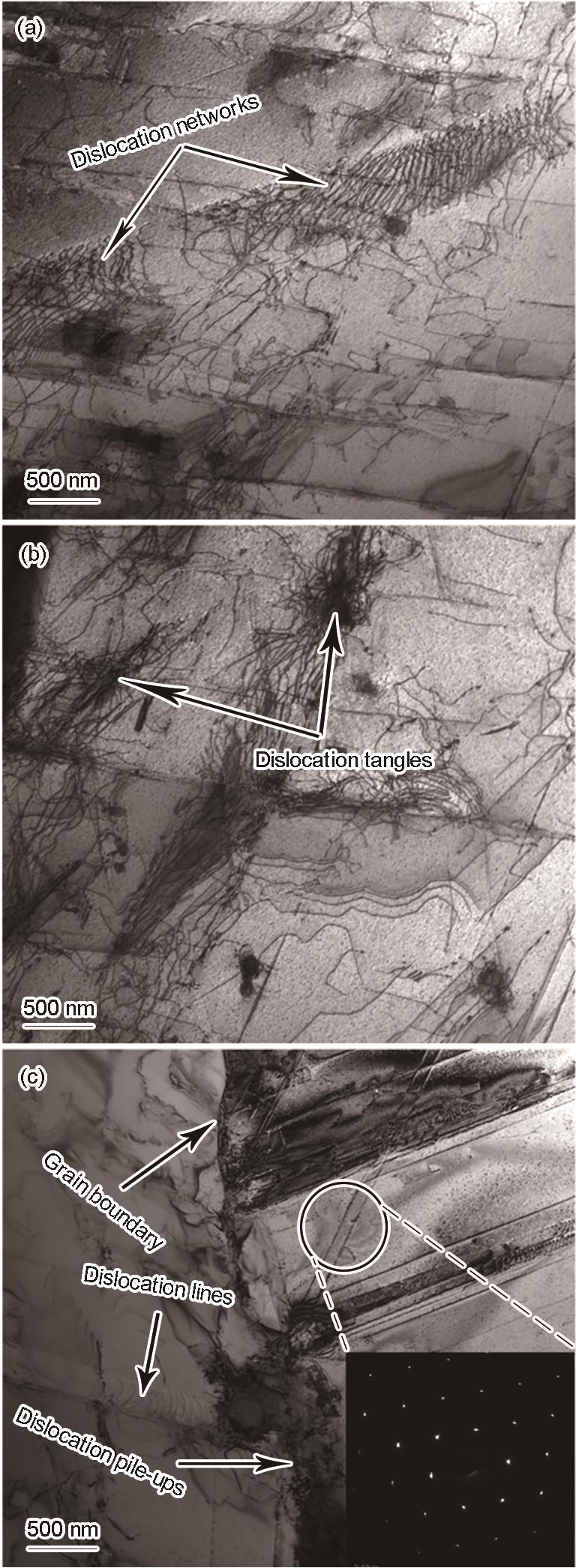 | Fig.8 TEM images showing the microstructures of GH3625 alloy after compression deformation at r = 0.5 mm/min (a) dislocation network(b) dislocation tangle(c) grain (Inset in Fig.8c shows the SAED pattern of deformation band ) |
