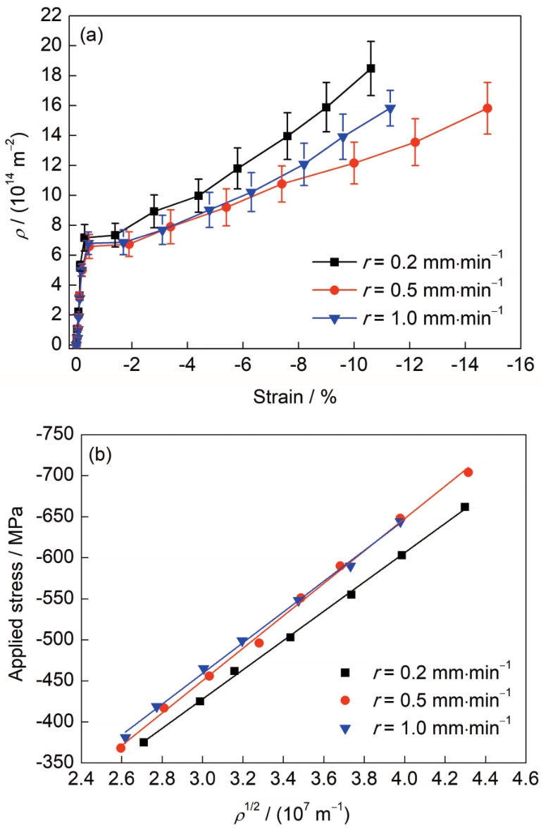 | 图10 不同变形速率下GH3625合金的总位错密度(ρ)随应变的变化规律和位错强化贡献 |