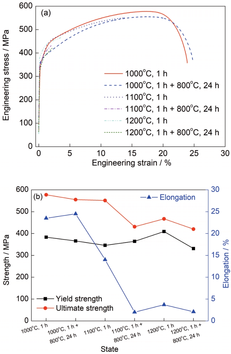 Fig.10 Engineering tensile stress-strain curves of the annealed and annealed + 800oC, 24 h re-aged C35MN alloy after 800oC, 24 h aging (a), and variation of mechanical property parameters with heat treatment states (b) |