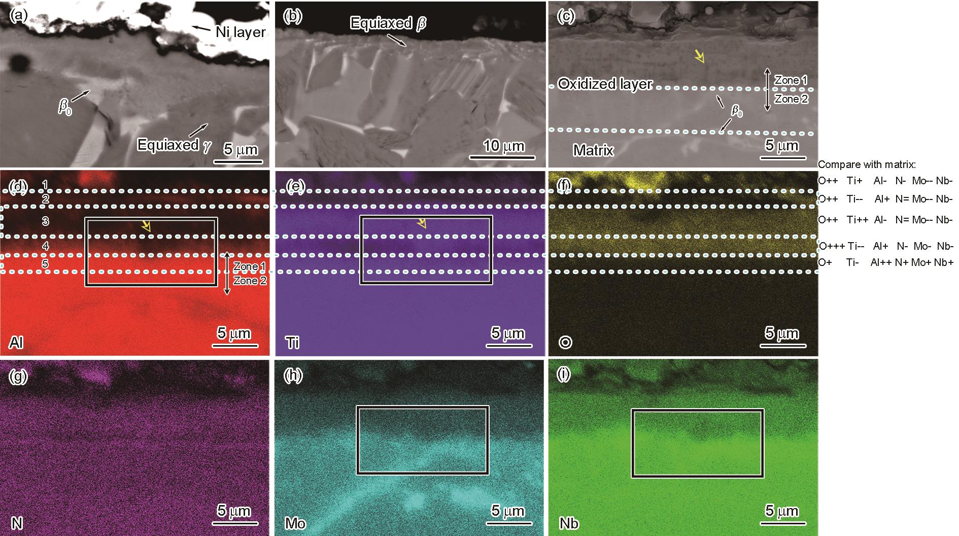 Fig.7 BSE images of microstructures near the reaction interface of samples thermal exposed for 10 h (a), 100 h (b), and 500 h (c), and element distributions of Al (d), Ti (e), O (f), N (g), Mo (h), and Nb (i) near the interface of sample thermal exposed for 500 h (Main elements in specific layer of oxidation were summarized in the right of Fig.7f; rectangulars in Fig.7d, e, h, and i show the main elements distributions near the reaction interface of β0 phase) |