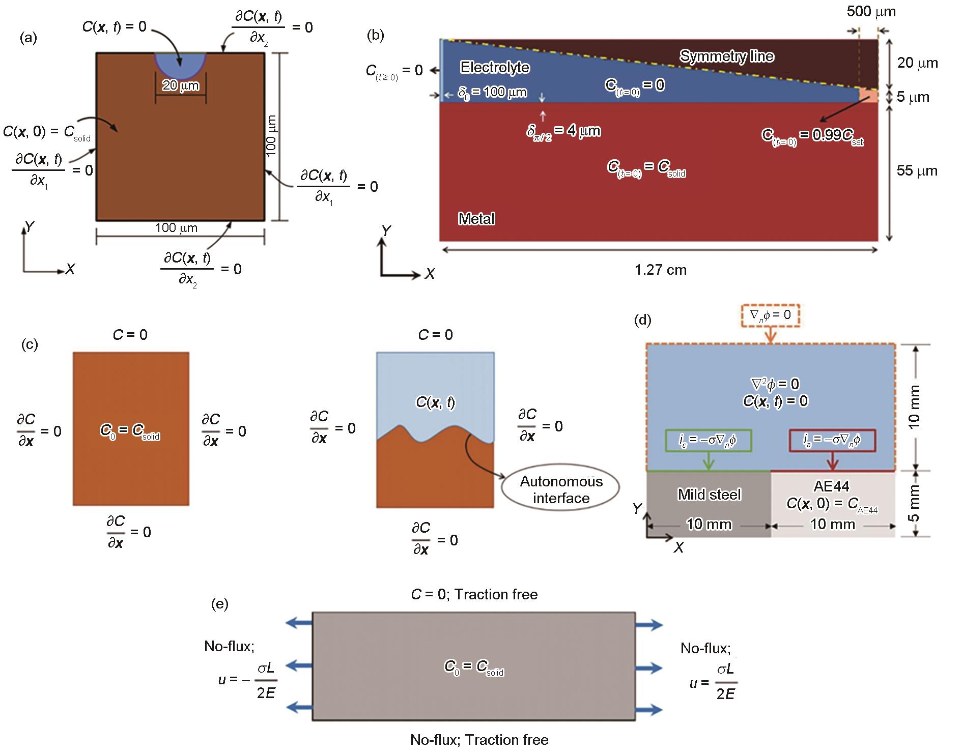 Fig.6 Initial and boundary conditions of 2D in PD of pitting corrosion (a)[60], crevice corrosion (b)[70], intergranular corrosion (c)[72], galvanic corrosion (d)[73], and stress corrosion cracking (e)[74] (X, Y—coordinates; C( x, 0)—concentration of material point x at t = 0; Csolid—concentration of solid node; and —derivative of concentration; C( x, 0) = Csolid, C( x, t) = 0, , and = 0—there is no flux around the boundary of the metal, except over the solid/liquid interface. δ0—subscripts are the values for the polar angle θ of the crevice; C(t ≥ 0) = 0—boundary concentration to the bulk dilute electrolyte; C(t = 0) = 0—concentration of electrolyte; C(t = 0) = Csolid—concentration of metal; C(t = 0) = 0.99Csat—concentration of the end of crevice. —derivative of concentration; C0 = Csolid—concentration of intact metal; C( x, t)—concentration of material point x. ϕ—second derivative of potential; ϕ = ϕ·n —potential gradient, n is normal vector; ic—cathode current density; ia—anodic current densities. u—displacement with tensile stress, σ—tensile stress, L—length of the domain, E—elastic modulus)