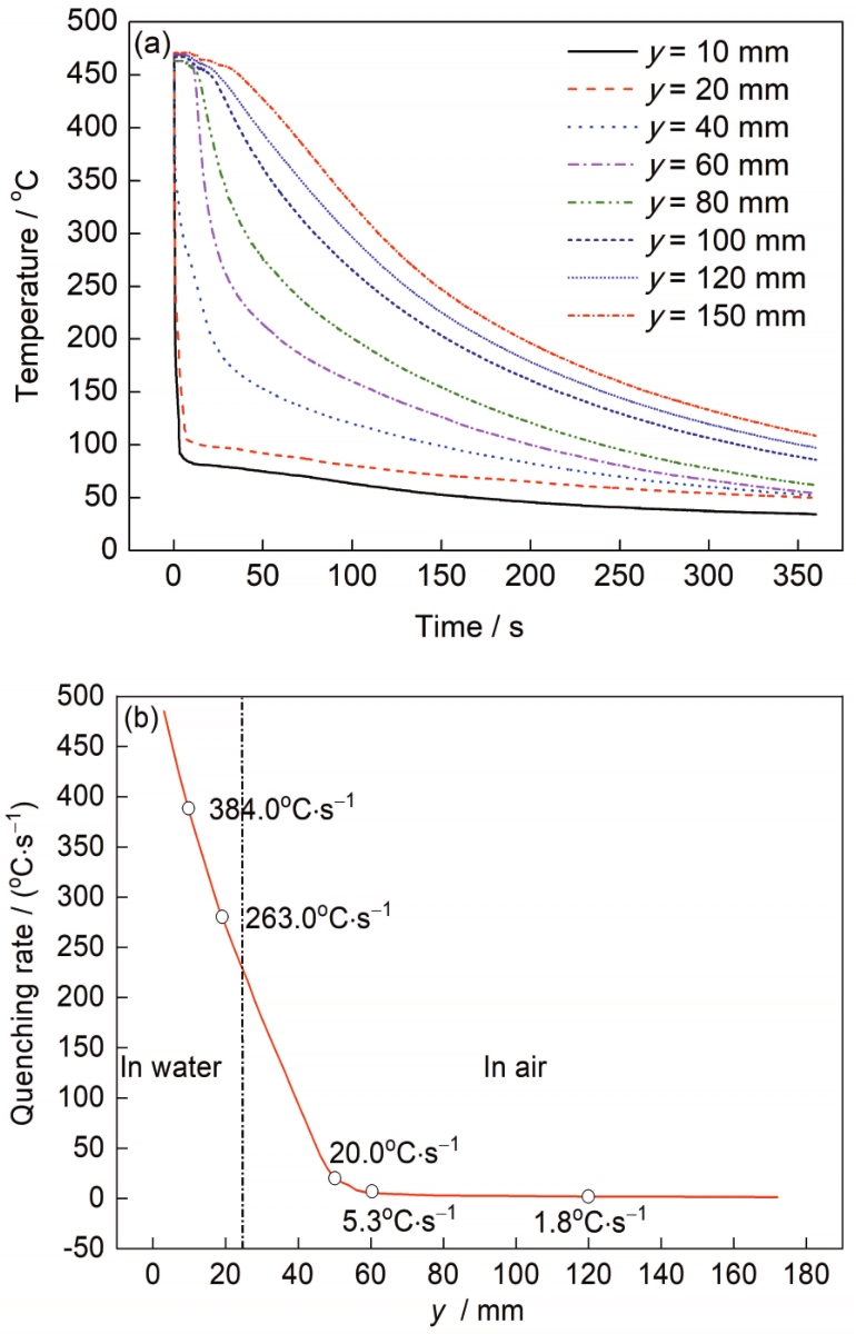 Fig.2 Cooling curves and average quenching rates at different positions of the 7136 aluminum alloy sample (a) time-temperature curve (b) average quenching rate |