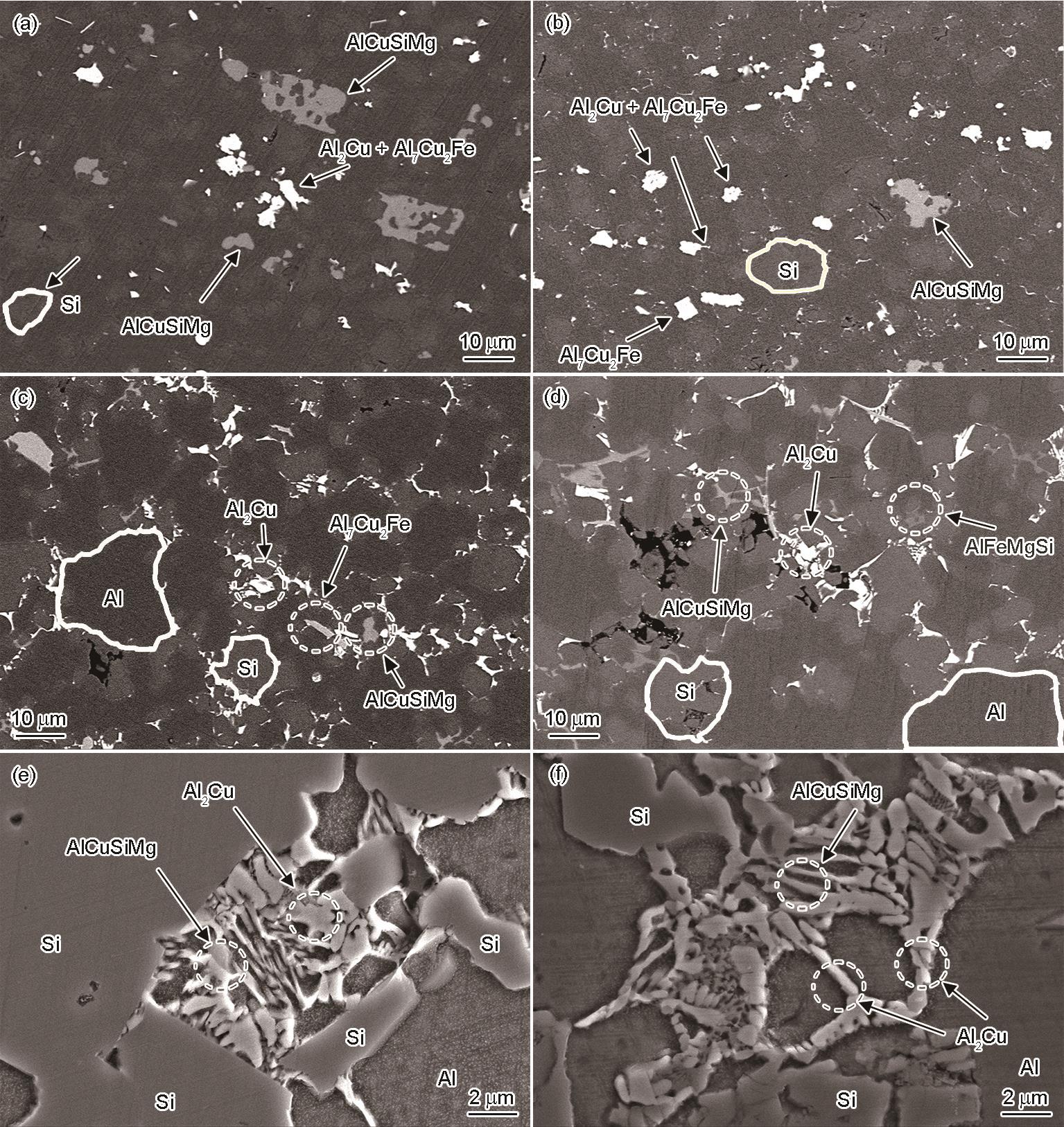 | Fig.5 SEM images of microstructures of spray-formed Al25Si4Cu1Mg alloy treated by different solution temperatures (solution time is 2 h) (a) 495oC (b) 515oC (c, e) 535oC (d, f) 555oC |