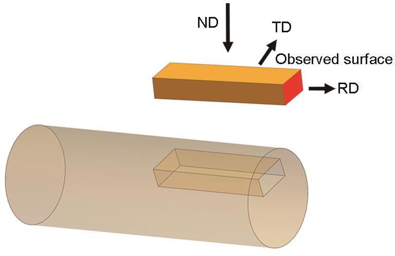 | Fig.1 Schematic of the seleced position of pure Ti sample (ND—normal direction, TD—transverse direction, RD—rolling direction) |