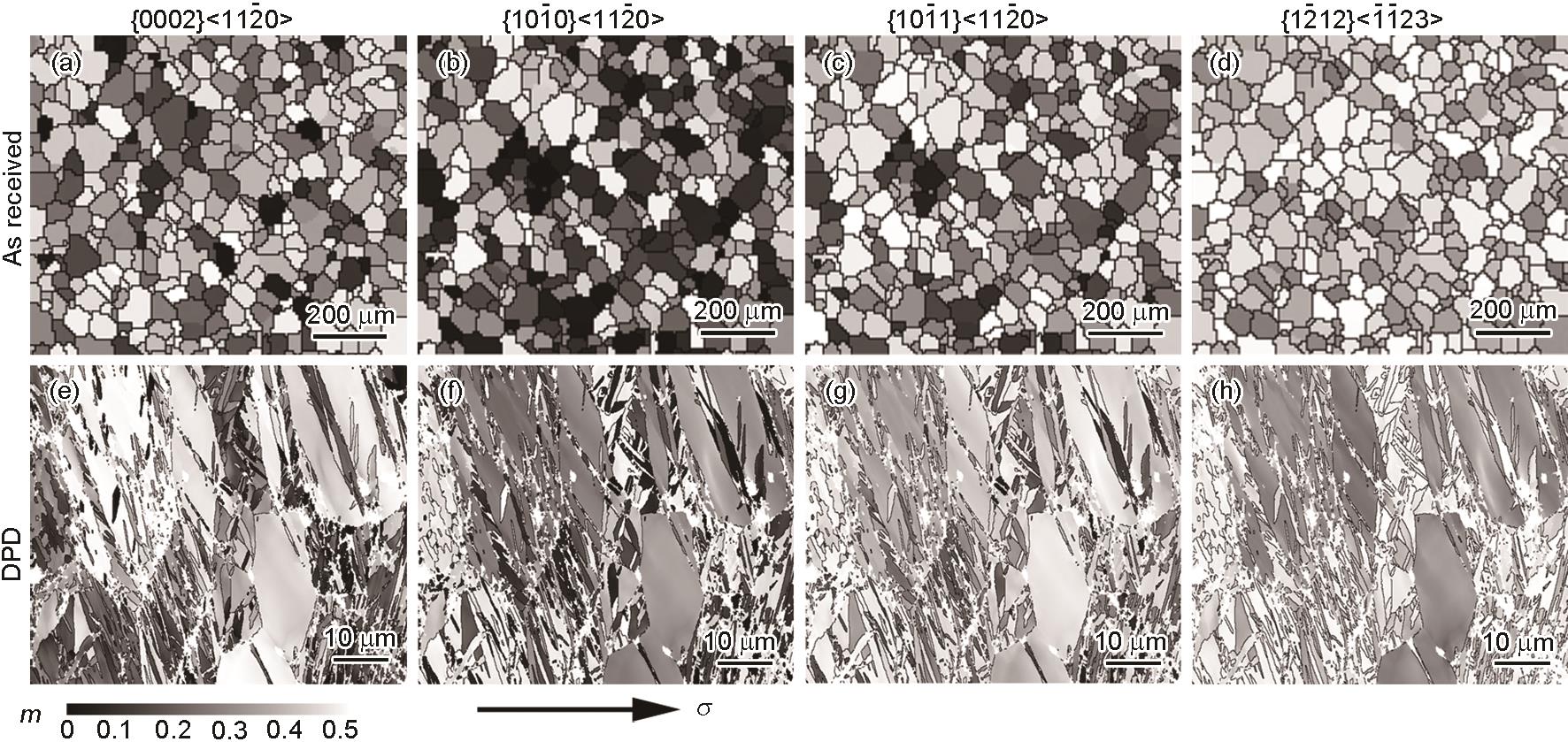 | Fig.5 Schmid factors (m) in basal slip (a, e), prismatic slip (b, f), pyramidal <a> slip (c, g), and pyramidal <c + a> slip (d, h) before (a-d) and after (e-h) DPD (σ—compression direction) |
