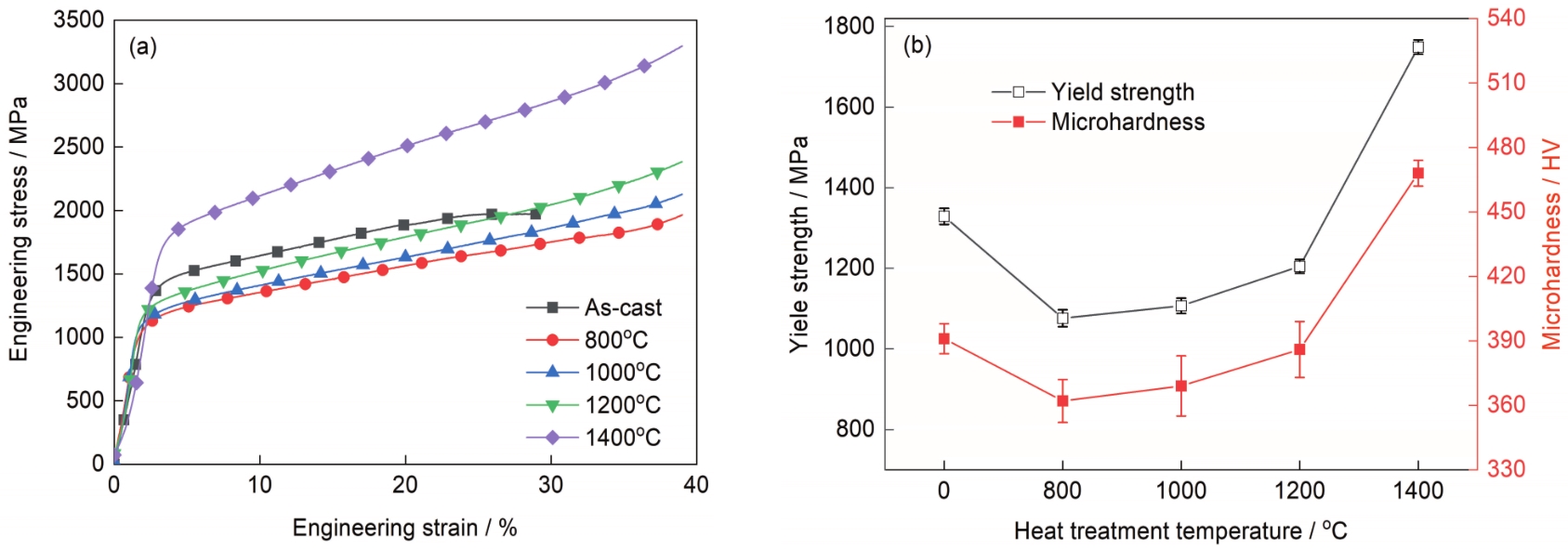 | Fig.5 Quasi-static compression properties of Ti0.5Zr1.5NbTa0.5Sn0.2 HEA (a) stress-strain curves at 5 × 10-4 s-1 strain rate (b) variation trend of yield strenghand microhardness with heat treatment temperature |