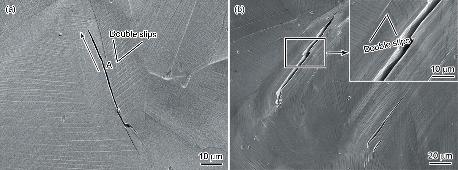 Fig.6 SEM images showing the damage features of Cu-15%Mn (a) and Cu-20%Mn (b) alloys at stress amplitude of 115 MPa (Arrow in Fig.6a shows the crack propagation direction, and sign A represents the position of the crack turning to the intergranular propagation, inset in Fig.6b shows the locally enlarged image) |