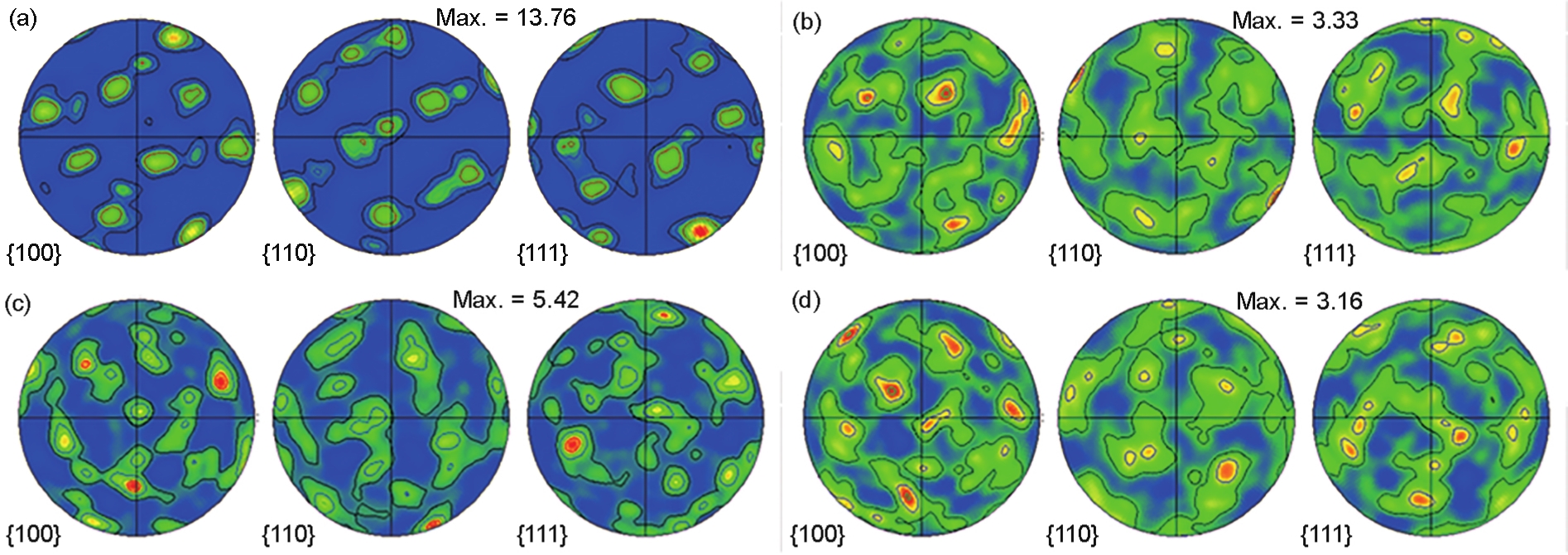 | Fig.7 Pole figures of ferrite phase in the vertical plane for different interlayer dwelling temperatures (a) 550oC (b) 180oC (c) 150oC (d) 110oC |