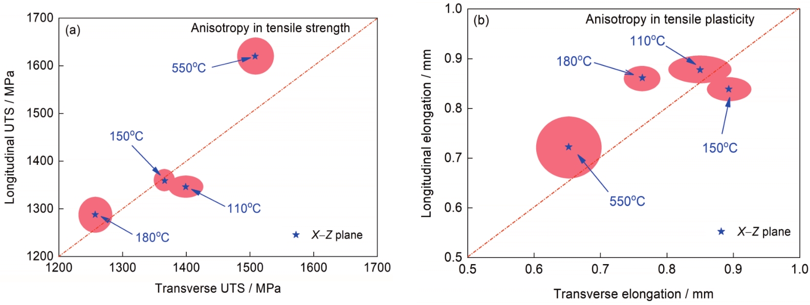 | Fig.13 Tensile anisotropy of WAAM 2Cr13 parts in the middle region (Pentagram: the average value of martensite length and width, translucent region: error range) (a) ultimate tensile strength (UTS) (b) elongation |