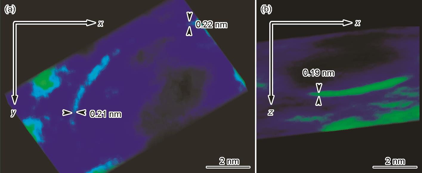 | Fig.6 Detection of Pt segregation in x-y plane (a) and x-z plane (b) (The color represent the intensity of the EDS signal of the Pt element, which gradually becomes more intense from blue to green) |