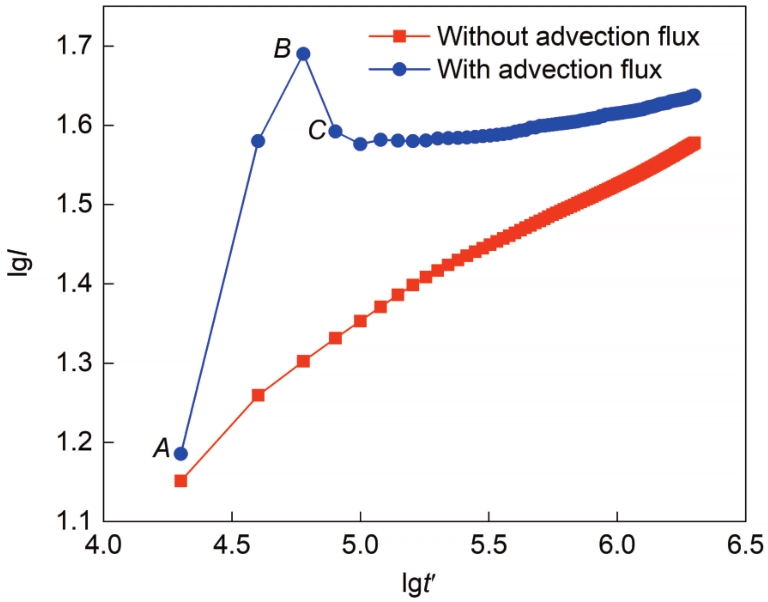 | Fig.3 Logarithmic growth curves of particle sintered neck methods for without and with advection flux (l—neck length, t'—time step) |