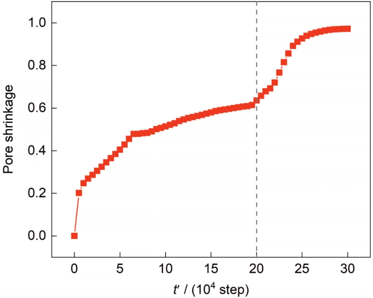 | 图6 平流通量作用下2个颗粒烧结过程中晶界的气孔收缩率 |